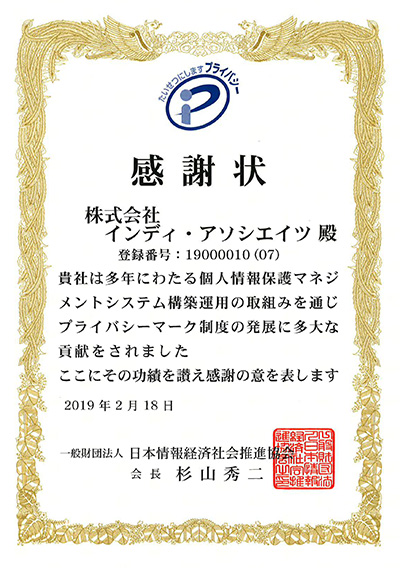 弊社は、プライバシーマーク制度貢献事業者として一般財団法人 日本情報経済社会推進協会(JIPDEC)より感謝状をいただきました。